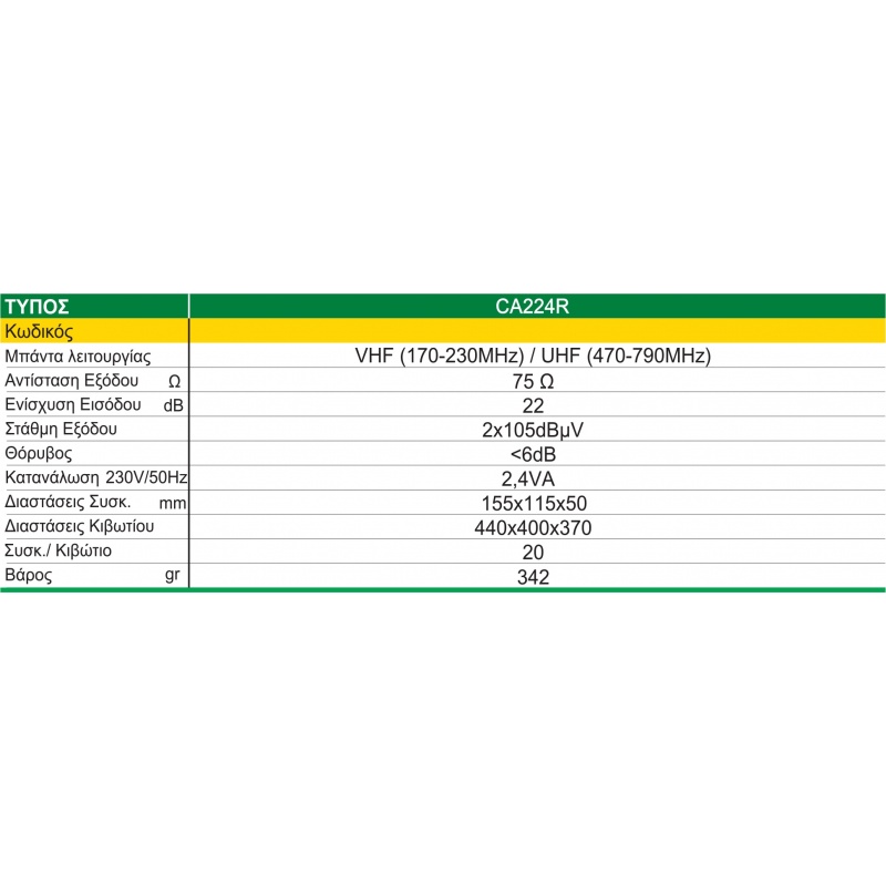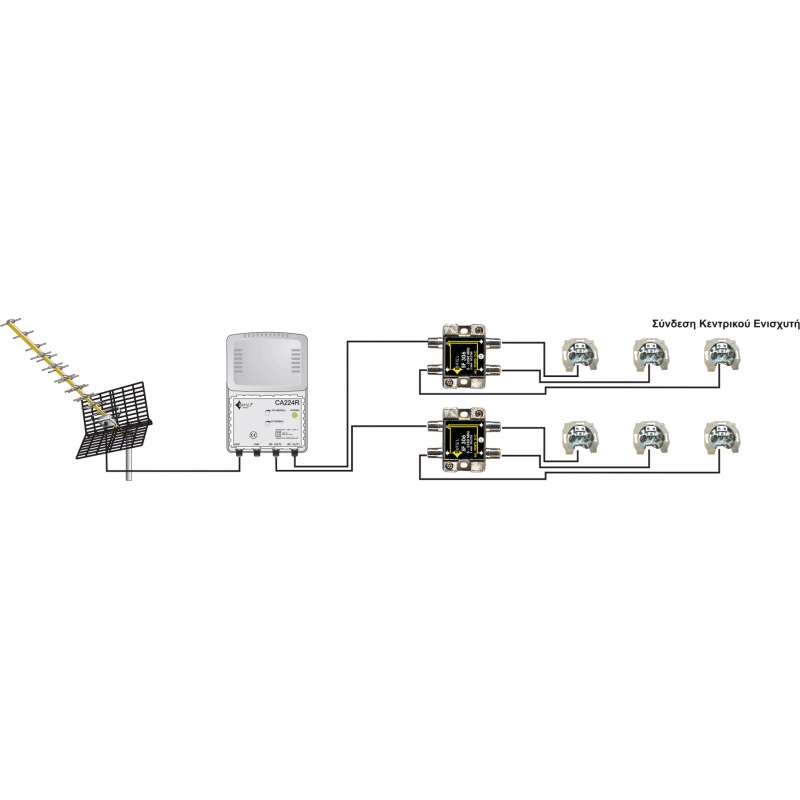 Κεντρικός ενισχυτής με μία είσοδο στην περιοχή των UHF και μία είσοδο στα VHF. Η περιοχή των UHF, σταματά στους 790ΜΗΖ. οι συχνότητες 4G, δεν ενισχύονται.