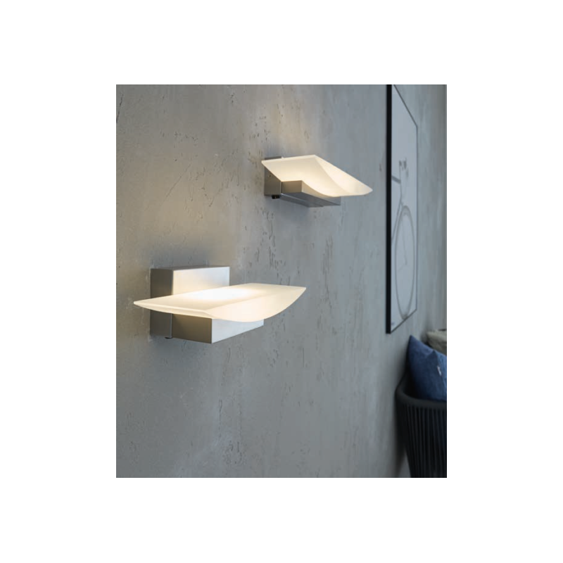 Απλίκα, μονόφωτο φωτιστικό τοίχου, τεχνολογίας LED, σε νίκελ ματ με λευκό ακρυλικό γυαλί. Διαθέτει διακόπτη.