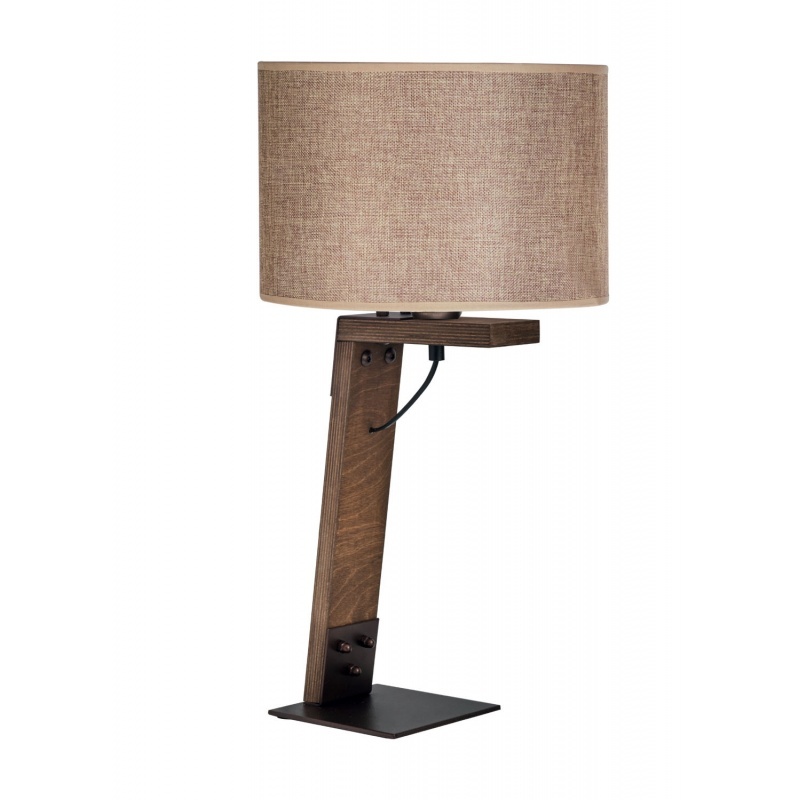 Επιτραπέζια λάμπα 1φ Ε27 σε μοντέρνα γραμμή, ξύλο σημύδα σε σκούρο χρώμα, μεταλλικά μέρη σε χρώμα σκουριά και αμπαζούρ ύφασμα σε χρώμα μόκα Φ30