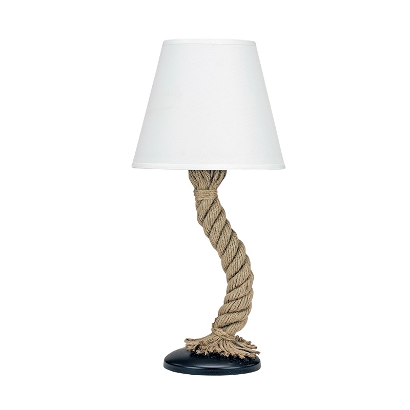 Επιτραπέζιο φωτιστικό σε μαύρο χρώμα με σχοινί και υφασμάτινο καπέλο.