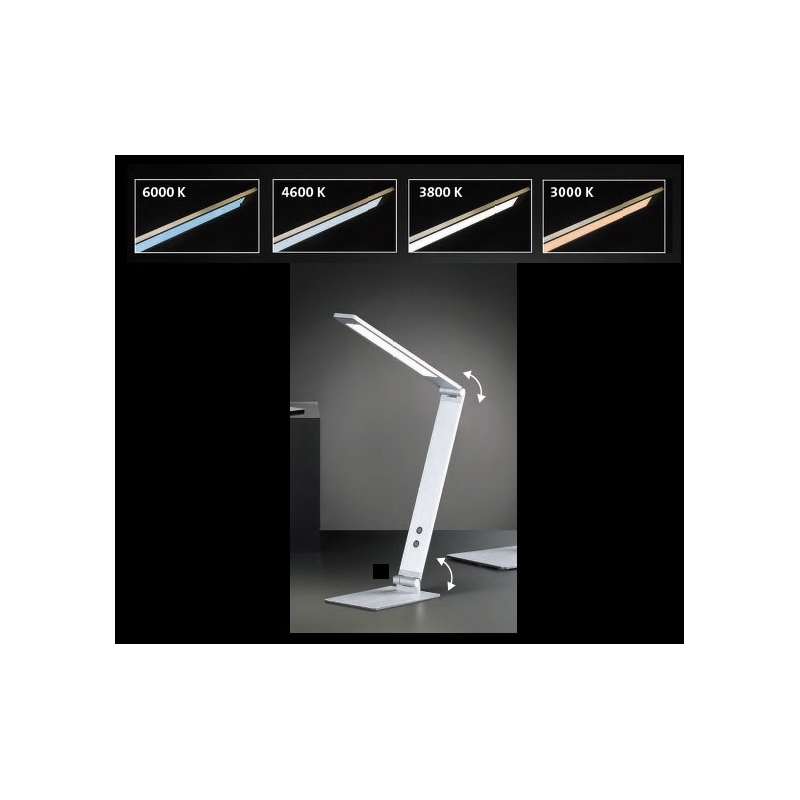 Επιτραπέζιο φωτιστικό, κινούμενο (με δυνατότητα αλλαγής θέσης φωτισμού), μονόφωτο φωτιστικό γραφείου, με ενσωματωμένο LED σε αλουμίνιο και σατινέ ακρυλικό γυαλί. Διαθέτει δυνατότητα αλλαγής θερμοκρασίας χρώματος και είναι ντιμαριζόμενο με διακόπτη αφής (touch dimmer).