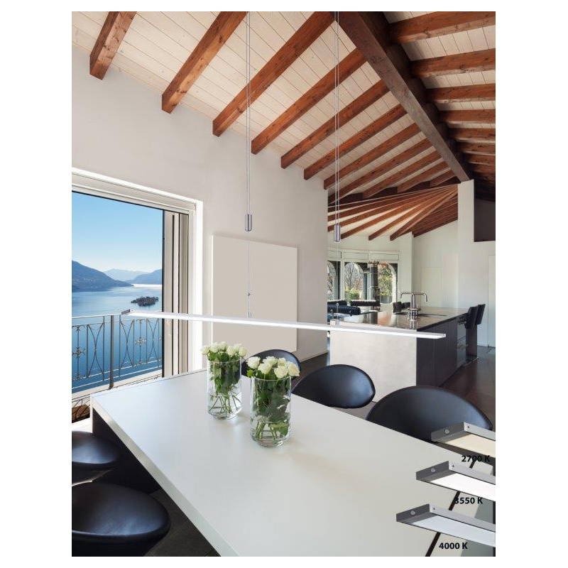 Κρεμαστό φωτιστικό οροφής, ράγα, μονόφωτο, με ενσωματωμένο LED, σε αλουμίνιο ματ, με σατινέ ακρυλικό. Διαθέτει δυνατότητα για αλλαγή θερμοκρασίας χρώματος και είναι ντιμαριζόμενο με κουμπί. Το ύψος του φωτιστικού ρυθμίζεται.
