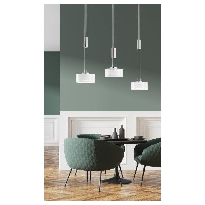 Κρεμαστό Φωτιστικό Οροφής, τρίφωτο, με ενσωματωμένο LED, μεταλλικό σε νίκελ ματ και χρώμιο και γυαλί σε όπαλ γυαλιστερό. Το ύψος του φωτιστικού ρυθμίζεται. Είναι ντιμαριζόμενο με διακόπτη τοίχου.
