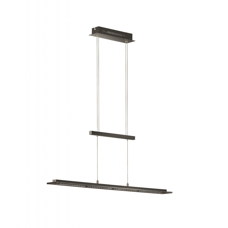 Γραμμικό κρεμαστό φωτιστικό οροφής, με ενσωματωμένο LED, σε χρώμιο και μαύρο χρώμα, με smoke σατινέ γυαλί. Το ύψος του φωτιστικού ρυθμίζεται. Διαθέτει δυνατότητα αλλαγής θερμοκρασίας χρώματος και είναι ντιμαριζόμενο με διακόπτη.