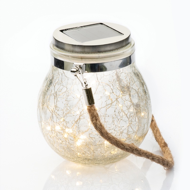 Διακοσμητικό γυάλινο κρακελέ βάζο με ηλιακό panel με ασημί καλώδιο χαλκού και 30 Led.