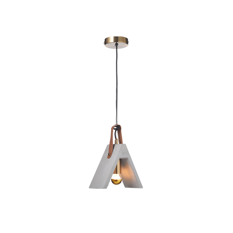 Μονόφωτο κρεμαστό φωτιστικό από μέταλλο και τσιμέντο, με δερμάτινη λεπτομέρεια. Τα μεταλλικά μέρη είναι στο χρώμα του ορείχαλκου.