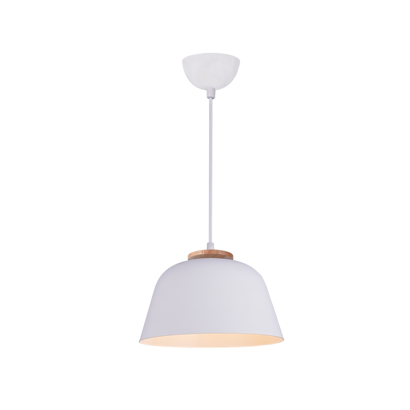 Μονόφωτο κρεμαστό φωτιστικό αλουμινίου σε λευκό ματ χρώμα με ξύλινες λεπτομέρειες.