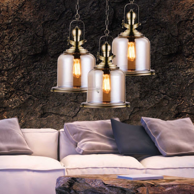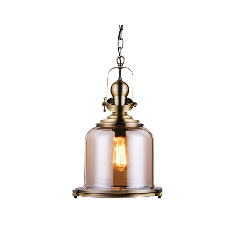 Μονόφωτο κρεμαστό φωτιστικό από γυαλί και μέταλλο σε μπροζέ χρώμα.
