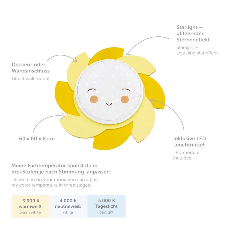 Φωτιστικό Τοίχου Ήλιος Sonne Siri StarlightΤο σούπερ χαριτωμένο φωτιστικό Ήλιος αφήνει το δωμάτιο κάθε παιδιού να λάμπει με το ενσωματωμένο εφέ starlight. Κατασκευασμένο στη Γερμανία. Το φωτιστικό είναι κατασκευασμένο από φυσικό ξύλο και είναι βαμμένο με βαφή χωρίς διαλύτες, με βάση το νερό. Τα μικρά ημιδιαφανή σημεία δημιουργούν έναν αστραφτερό έναστρο ουρανό.Έχει ενσωματωμένο LED 14 Watt. Επιπλέον, η θερμοκρασία χρώματος μπορεί να ρυθμιστεί από θερμό λευκό έως ψυχρό λευκό (3000-5000 Kelvin).