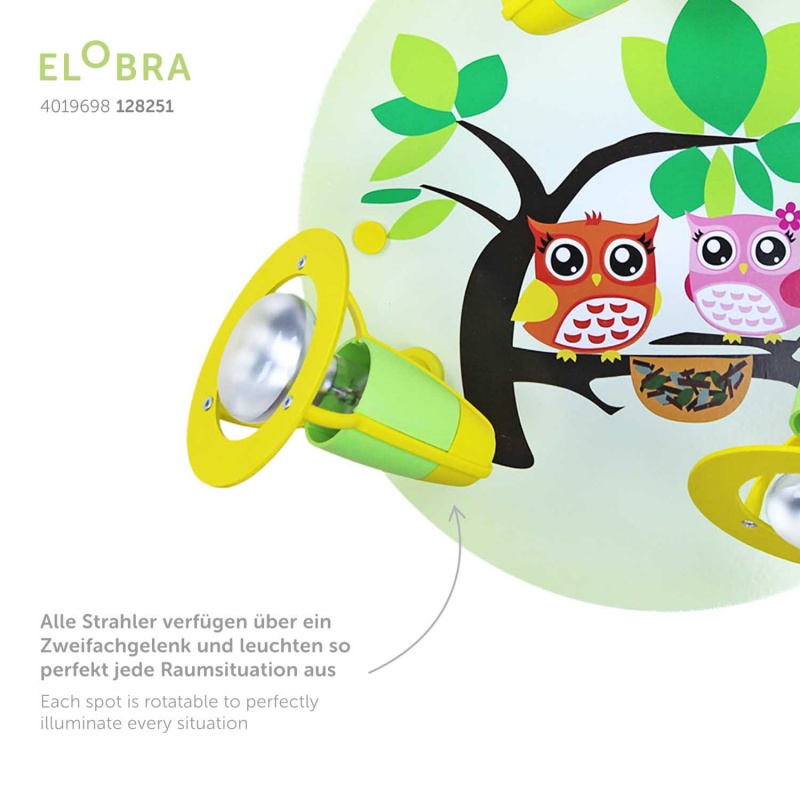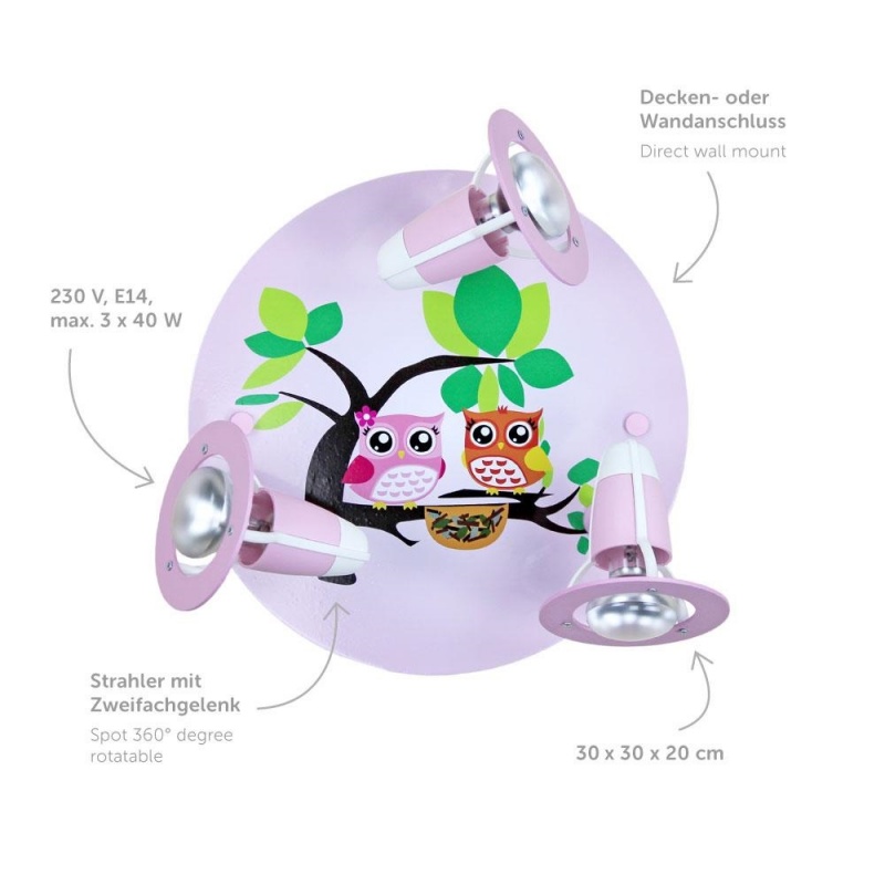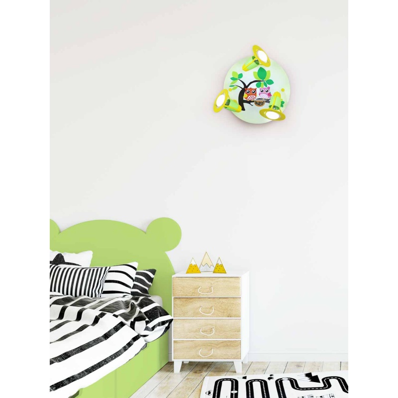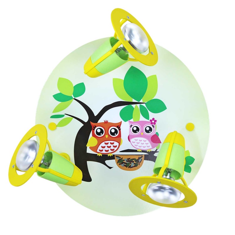 Φωτιστικό Τοίχου-Οροφής Κουκουβάγια Πράσινο OwlΤο φωτιστικό με χαριτωμένες κουκουβάγιες δημιουργεί υπέροχο φωτισμό στο δωμάτιο του μικρού σας ήρωα. Τα σποτ μετακινούνται.Κατασκευάζεται με αγάπη στη Γερμανία από φυσικό ξύλο. Επιπλέον πληροφορίες:Βάρος: 0,5 kg Διαστάσεις: 30 x 30 x 20 cm Χρώμα πράσινο Υλικό: ξύλο Τάση: 230 V Λαμπτήρες: 3 x E14 Μέγιστη ισχύς: 40 watt