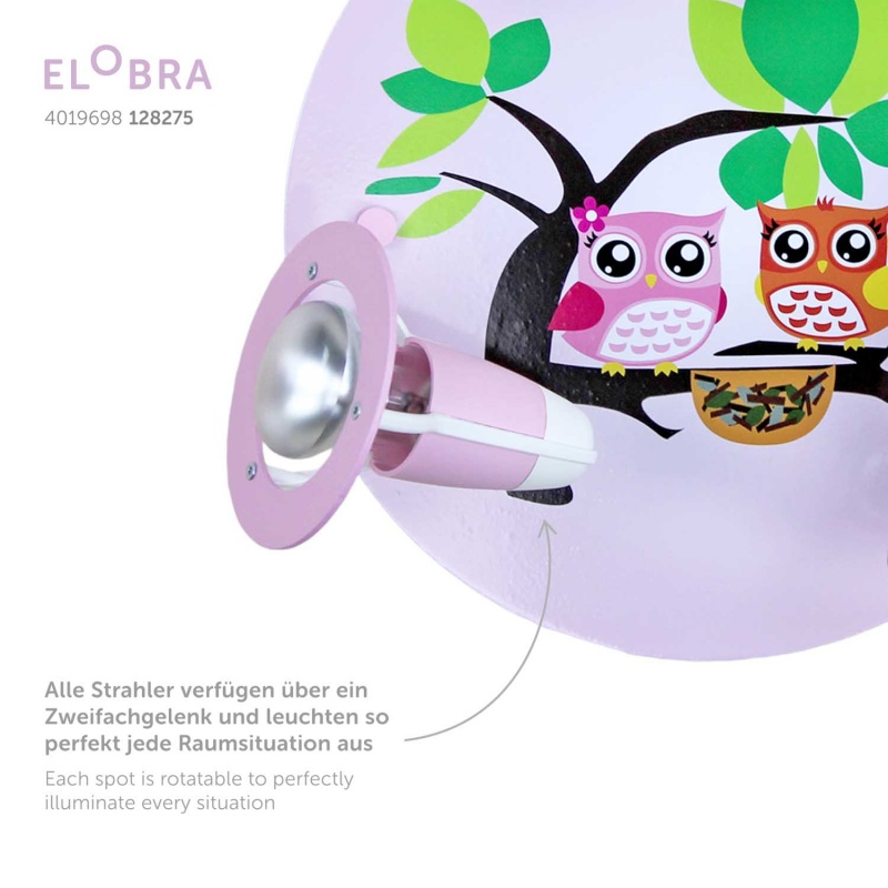 Φωτιστικό Τοίχου-Οροφής Κουκουβάγια Ροζ OwlΤο φωτιστικό με χαριτωμένες κουκουβάγιες δημιουργεί υπέροχο φωτισμό στο δωμάτιο του μικρού σας ήρωα. Τα σποτ μετακινούνται.Κατασκευάζεται με αγάπη στη Γερμανία από φυσικό ξύλο. Επιπλέον πληροφορίες:Βάρος: 0,5 kg Διαστάσεις: 30 x 30 x 20 cm Χρώμα ροζ Υλικό: ξύλο Τάση: 230 V Λαμπτήρες: 3 x E14 Μέγιστη ισχύς: 40 watt