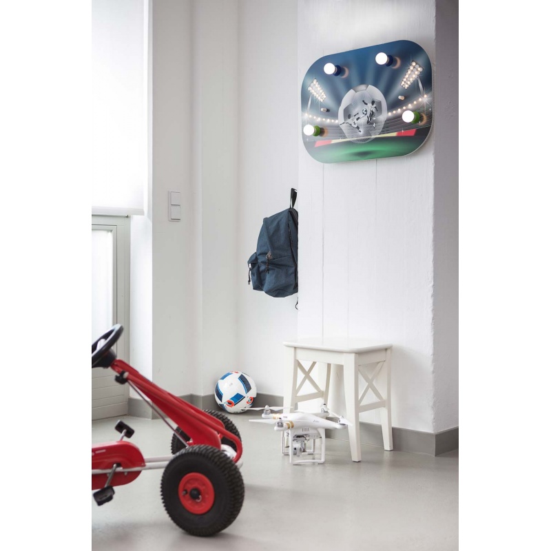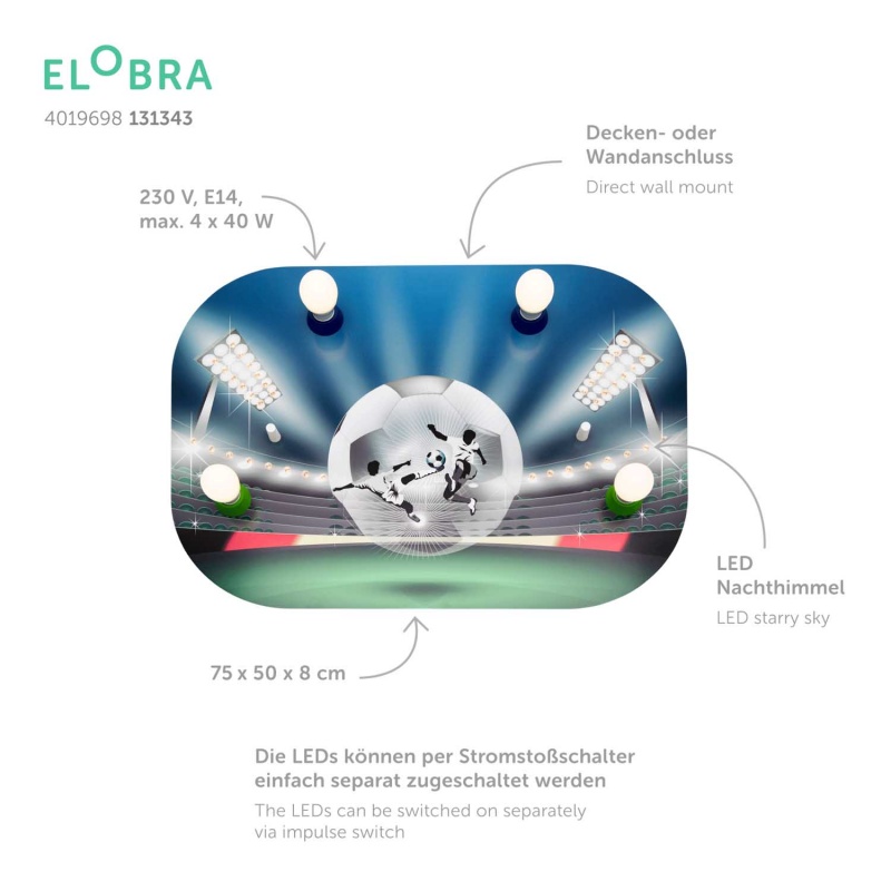 Φωτιστικό Οροφής Ποδόσφαιρο Football Arena Soccerfight. Κάθε παιδικό δωμάτιο γίνεται χώρος δημιουργικού παιχνιδιού. Κατασκευασμένο από φυσικό ξύλο και βαμμένο με βαφή χωρίς διαλύτες, με βάση το νερό.Κατασκευάζεται με αγάπη στη Γερμανία.Διαθέτει 4 λαμπτήρες E14, δεν συμπεριλαμβάνονται, και 40 ενσωματωμένα LED.Διαθέτει λειτουργία νυχτερινού φωτός:ΠΑΤΗΜΑ ΔΙΑΚΟΠΤΗ 1 ΦΟΡΑ: Κύριο Φως & Νυχτερινό Φως αναμμένα ΠΑΤΗΜΑ ΔΙΑΚΟΠΤΗ 2 ΦΟΡΕΣ: Κύριο Φως αναμμένο & Νυχτερινό Φως σβηστό ΠΑΤΗΜΑ ΔΙΑΚΟΠΤΗ 3 ΦΟΡΕΣ: Κύριο Φως σβηστό & Νυχτερινό Φως αναμμένο ΠΑΤΗΜΑ ΔΙΑΚΟΠΤΗ 4 ΦΟΡΕΣ: Κύριο Φως σβηστό & Νυχτερινό Φως σβηστό