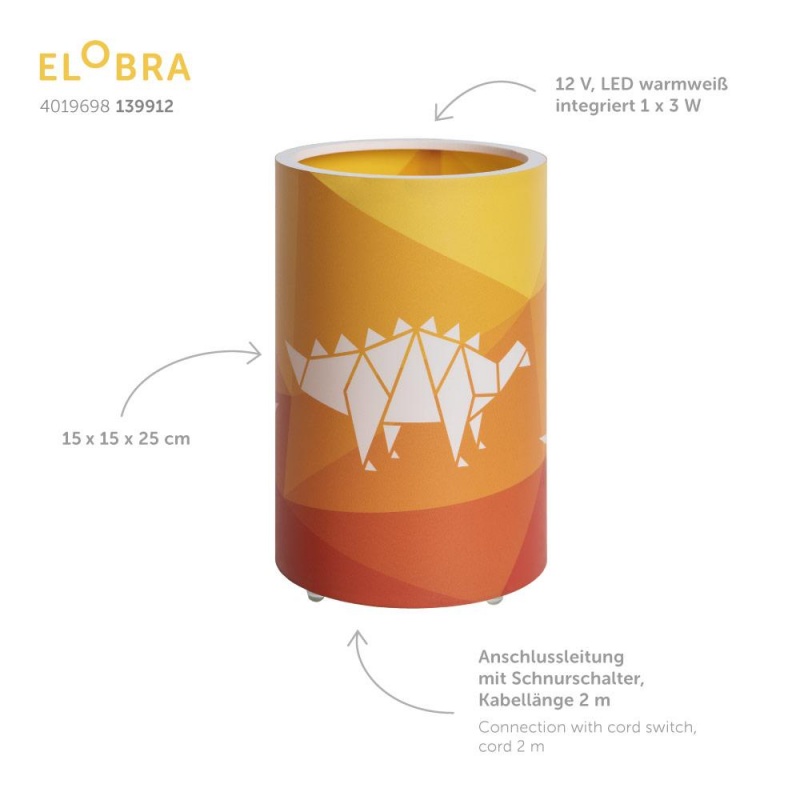 Πορτατίφ LED Δεινόσαυροι Πορτοκαλί DinosΔεινόσαυροι σε συνδυασμό με μοντέρνο ντιζάιν - οι γίγαντες ξαναζωντανεύουν στα φωτιστικά του παιδικού δωματίου από τη συλλογή "Dinopoly". Σε συνδυασμό με έντονα χρώματα και κομψά μοτίβα δεινοσαύρων, αυτά τα παιδικά φωτιστικά είναι ο τέλειος σύντροφος για τους μικρούς θαυμαστές των δεινοσαύρων.Κατασκευάζεται με αγάπη στη Γερμανία. Το φωτιστικό είναι βαμμένο με βαφή χωρίς διαλύτες, με βάση το νερό.Διαθέτει 2μ καλώδιο με διακόπτη.Χειροποίητο-Κατασκευάζεται με αγάπη στη Γερμανία.