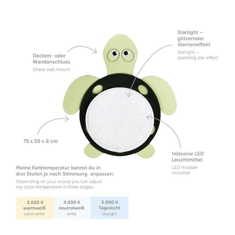 Φωτιστικό Οροφής LED Χελώνα Turty StarlightΤο σούπερ χαριτωμένο φωτιστικό Χελώνα αφήνει το δωμάτιο κάθε παιδιού να λάμπει με το ενσωματωμένο εφέ starlight. Το φωτιστικό είναι κατασκευασμένο από φυσικό ξύλο και είναι βαμμένο με βαφή χωρίς διαλύτες, με βάση το νερό. Τα μικρά ημιδιαφανή σημεία δημιουργούν έναν αστραφτερό έναστρο ουρανό.Είναι χειροποίητο. Κατασκευασμένο με αγάπη στη Γερμανία.Έχει ενσωματωμένο LED 12 Watt. Επιπλέον, η θερμοκρασία χρώματος μπορεί να ρυθμιστεί από θερμό λευκό έως ψυχρό λευκό (3000-5000 Kelvin).