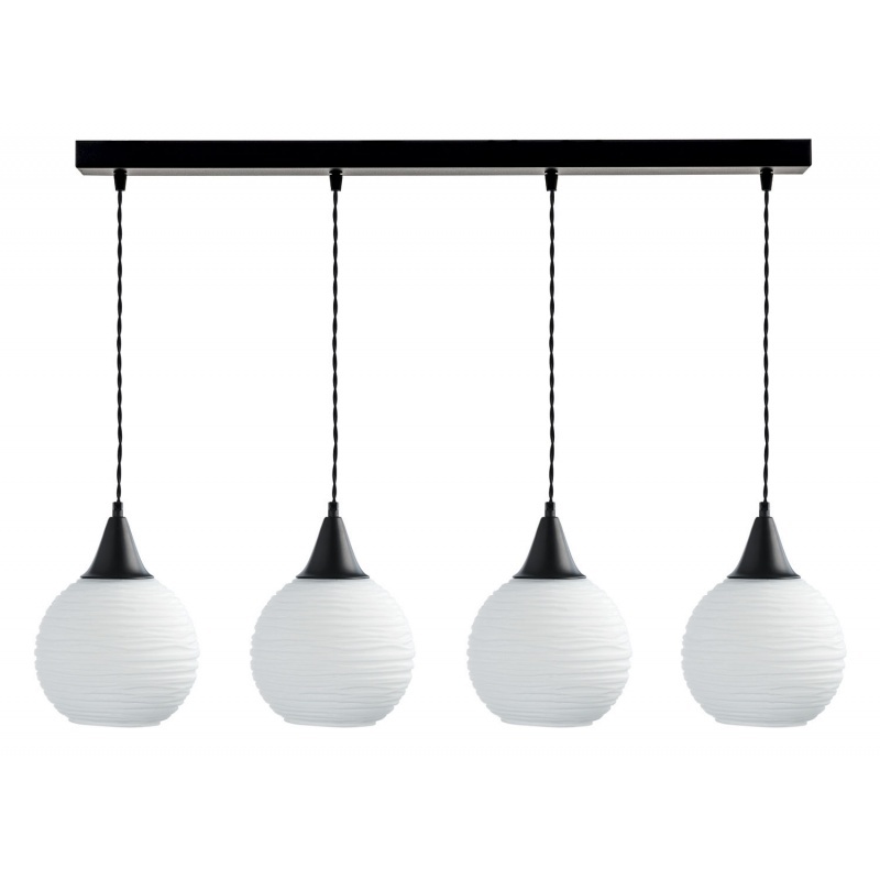 Φωτιστικό πολύφωτο ράγα 4φ Ε27,γυαλί σε χρώμα opal ματ, μεταλλικά μέρη μαύρα και καλώδιο υφασμάτινο στριφτό μαύρο