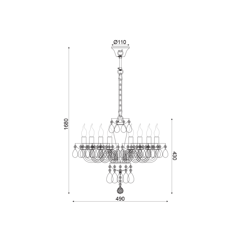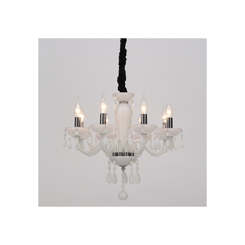 Μεταλλικό οκτάφωτο κρεμαστό φωτιστικό σε λευκό χρώμα, διακοσμημένο με κρύσταλλα.