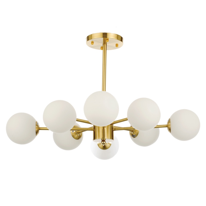 Οκτάφωτο μεταλλικό φωτιστικό στο χρώμα του χρυσού και λευκά γυαλιά.