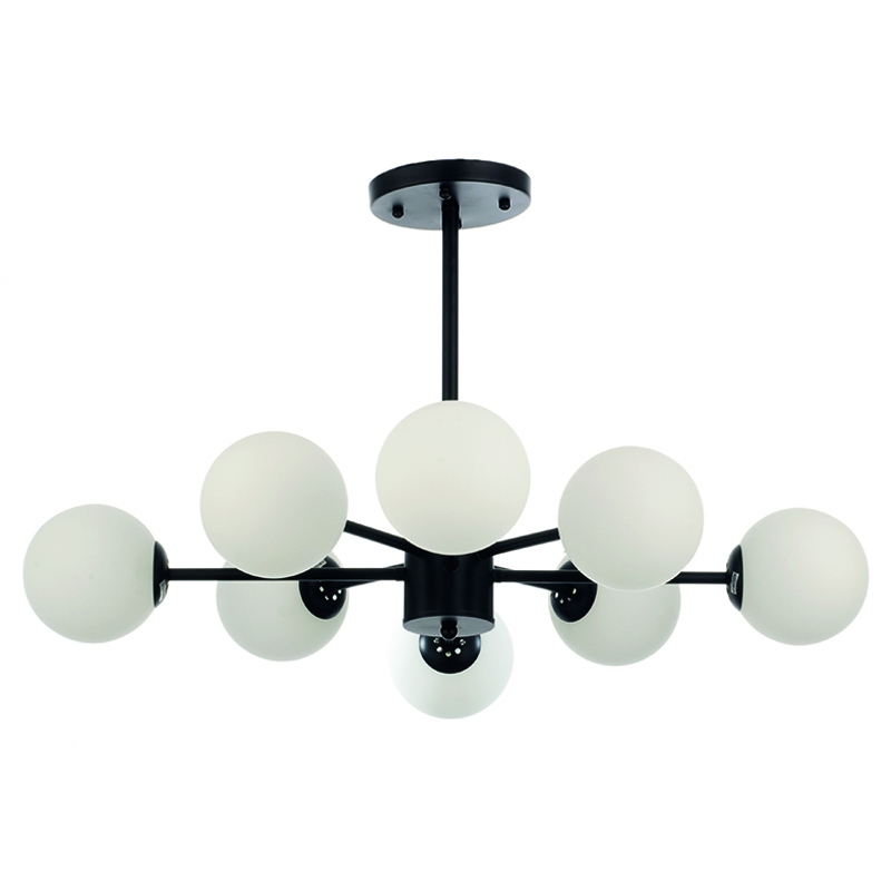Οκτάφωτο μεταλλικό φωτιστικό σε μαύρο χρώμα και λευκά γυαλιά.