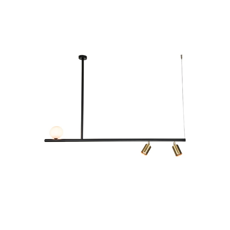 Πολύφωτο κρεμαστό μεταλλικό φωτιστικό σε μαύρο χρώμα, σπότ στο χρώμα του ορείχαλκου και γυαλί.