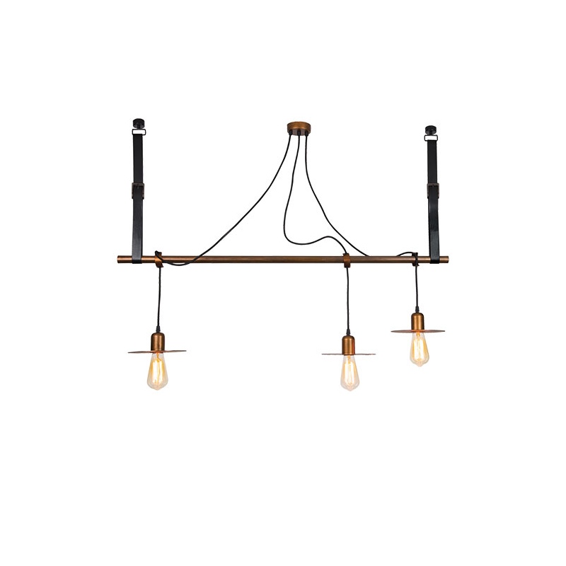 Τρίφωτο κρεμαστό φωτιστικό ράγα από μέταλλο και δερμάτινες ζώνες στο χρώμα του σκουριασμένου χαλκού.